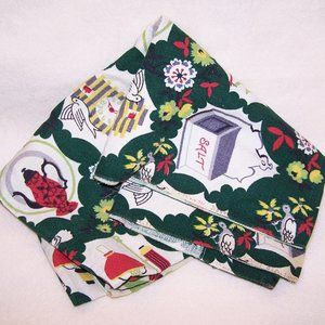 I found this bark cloth in 2020 at an estate sale right before COVID hit. The estate was an untouched gem which held so many treasures I thought I had died and gone to heaven. Anyway, I always thought that I would use this bark cloth for some project but I just never got around to it so, here it is. Bark cloth of a country kitchen fashion. Featuring an Forest Green base, the motifs to the piece contain a weathervane (jockey), salt box, lot of birds, flowers, a teapot, a clock and a few other bits. Size of each panel is 5' 3" x 16-1/2" and yes, there is an open area at the top (and bottom) for a rod, and the sides are finished. I hope someone can find a purpose for these vintage textiles.