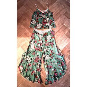 2 Pc Anthropologie Sz M Layla Sleep Cami Top Pants Ruffle Floral Birds Dot Green