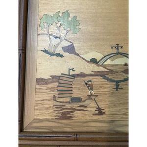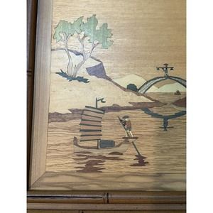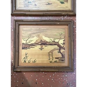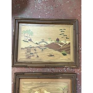 2 Pc Asian Mid Century Modern Framed Wood Cut Out Inlay Wall Art