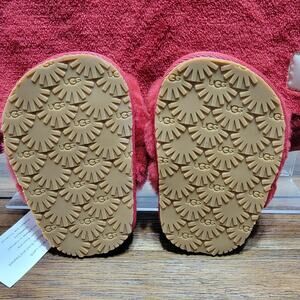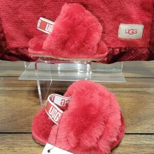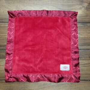 2 Pc Infant UGGs Red Slippers w/ Matching Security Blanket Lovey in Box - Size 2/3 NWT. The slippers are made of real fur from Lamb. The security blanket is 100% Polyester. The box is a little rough, but the slippers and security blanket are new. Comes from a smoke free home.