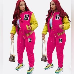 2 Pc: Pink & Yellow Varsity Jacket & Jogger Pants w/Letter “B” Embroidery, NIP