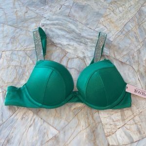 Styled like your favorite push-up bra and finished with gleaming rhinestone straps, this style is sure to get noticed at the beach and beyond.