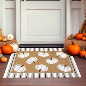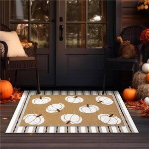 🧿Fall Theme Design: the front door rug adopts neutral style design, beige stripes simple and versatile, can be naturally integrated with a variety of home styles, creating a warm and comfortable entrance atmosphere; With the classic pumpkin elements, it adds the festive atmosphere of fall harvest and Thanksgiving, making the entrance decoration both stylish and seasonal