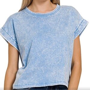 Stylish light blue acid wash t-shirt with rolled sleeves. Perfect for casual wear.