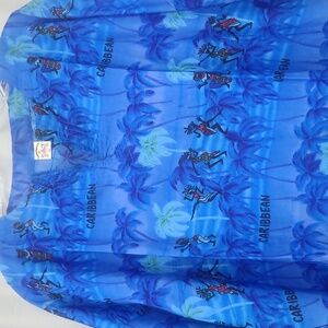 2 Piece Blue Matching Tunic & Pants Caribbean Palms & Dancers Print Resortwear