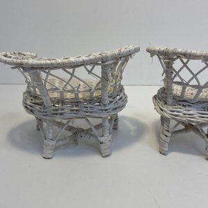 Beautiful 2 Piece White Whicker Doll Chair Set. 1 Loveseat Style 6.5" Wide, 5.25" Depth, and 5" Tall. 1 Single Seat 4.5" Wide, 3.75" Depth, 5.5" Tall. Boho Style white wicker. Keep as is or repaint!