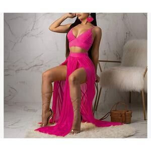 Details: 2 piece skirt set, spaghetti straps, sleeveless, deep v neck, high split, high waist, backless, Bra crop top, slit maxi dress with double front slits, chiffon skirt, skirt has underwear of the same color built into it that is difficult to see in the picture