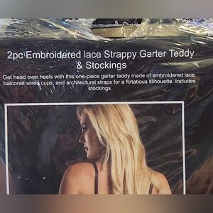 2 Piece Embroidered Lace Strappy Garter Teddy & Stockings NWT Black