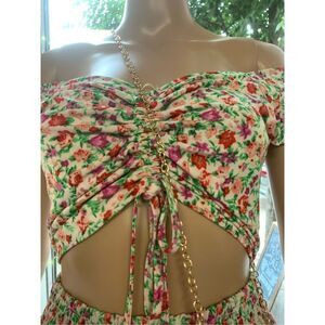 Ladies super cute multicolored floral patterned top and ruffled detail skirt set. New with tags. Excellent condition. Ladies size large/XL. Material is stretchy.