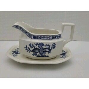 2 Piece Kensington Coventry Blue Onion Gravy Boat Underplate English Ironstone