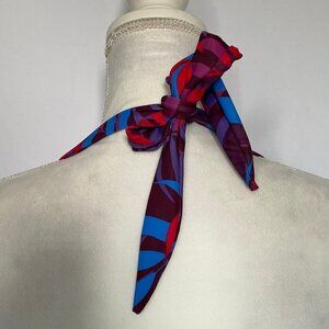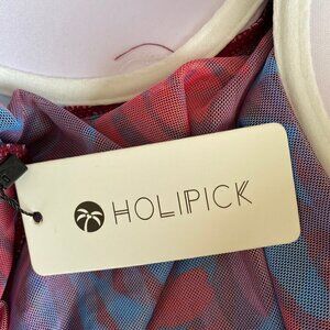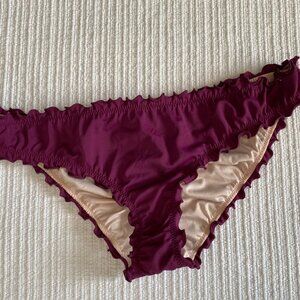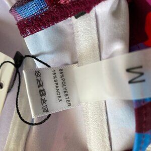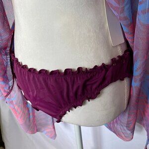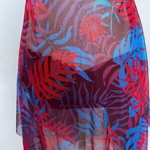 2 Piece Mesh Tropical Print Bathing Suit...Top with Bra design and see through Mesh skirt...tie front design...tie around neck for support...back out...Maroon color Bikini Bottoms with low waist and lettuce design trim...Top by Holipick Leaf design of red blue maroon & purple...Bottoms by Shade and Shore...see photos for details...050522