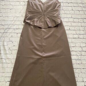 Mori Lee Dress Size 24 2 Piece Skirt Set Taupe Color Formal A Line Party Bridesmaid Special Occasion Wedding. Zipper in back of top and in the back of the skirt. Lined. Waist sits at natural waist. Boning on the sides of the top. Very nicely made. This Outfit is new with Out Tags. Only Flaw is an ink line on waist. Cannot be seen when wearing. Might come off but have not tried. Size 24. Top: Pit to Pit: 20" Length: 20" Skirt Waist: 18" Length: 40". Just Beautiful!!!!