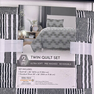 2 Piece Reversible Twin Quilt Set Oeko Tex Soft Grey Black White Striped Unisex