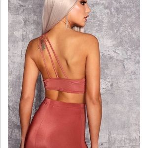 Perfect for date night or a night out with your girls! Top is a US size 8 & bottoms are a US size 6. Material is slinky..very lightweight & stretchy. Top is one strap & the skirt is high waisted, also very form fitting. Super cute set, still in packaging with tags! This set would fit anyone who’s a size medium!