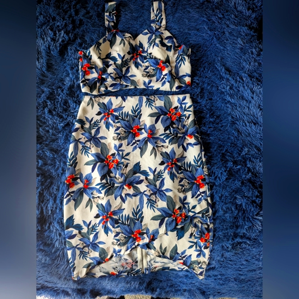 2 piece set. Bra top with zipper back. Pit to pit, approx. 16". Shoulder to bottom 13". Pencil zip skirt. Width 14". Length at hip 24", middle 19". Very cute vacation/cruise set. Size medium. No stretch to material. Kept in a smoke free home.