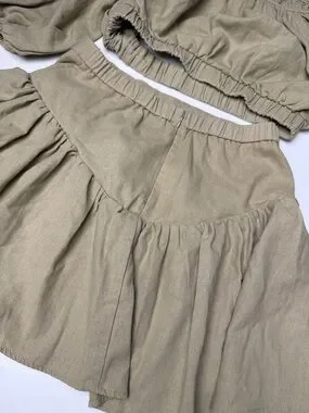 A-line mini skirt with soft gathered tiers. Smooth waistband for a clean fit. Lightweight flow and feminine silhouette. Easy to pair with tops for casual or dressy looks.