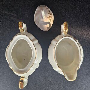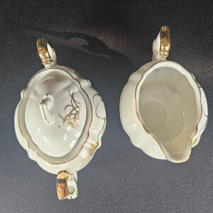 This 1940s Demitasse size sugar and creamer set by Lefton is quite elegant. The crisp white China is gilt with hand painted images of wheat sheaves. There is also gilding on the top edge handle and feet. The two pieces are in very nice condition for 1940s China. No chips, cracks, nicks or crazing. There are a couple of black specs in the Sugar Bowl and also a little black speck inside, under the rim of the Creamer. See my pictures pointing this out. Hand Wash. Sugar Bowl height 1 3/4" by 4 1/4" long by 3 inches wide. Creamers 2 3/8 by 4 1/4" long 3 inches wide. Made in USA/Japan. Marked on the bottom of each piece Lefton China hand painted. REG US patent 201 20. Non smoking pet free home. @ ER NW Boxed
