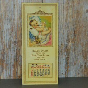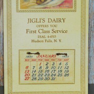 Both are from Gigli's Dairy of Hudson Falls, NY. The bottle is 7 inches high with a 2 3/4 inch base diameter. The calendar would have been given out at Christmas time to customers along the route. Does have some spots on the picture. 9 inches long, 4 wide.
