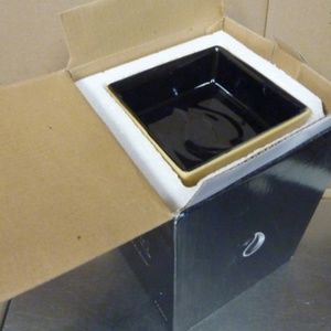 Square two-piece electric tart warmer is made of ceramic with a antique yellow glaze featuring an embossed vine design on each side. Exquisite! Please note that the color best resembles the manufacturers picture (first one) - a maize yellow color. My camera doesn't capture the color accurately.