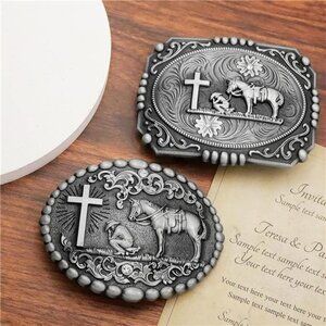 2 Pieces American Western Cowboy Belt Buckles, Mens Religion Cross Horse