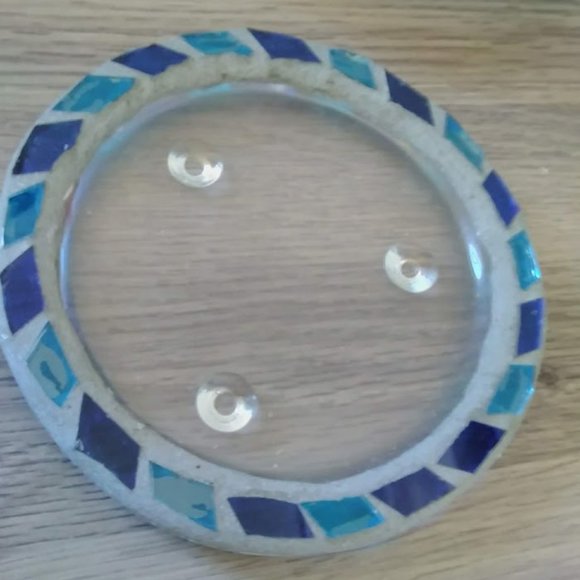2 beautiful glass candle holders. Both have mosaic glass inlay around the edge. The blue one is for a standard pillar candle, measures approx. 4.5 inches across. The larger one with green/pink/yellow/orange glass inlay is for a 3-wick candle. Measures approx. 7 1/4 inches across. Both are in great shape.