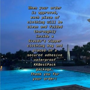 When your order is approved, each piece of clothing will be clean and folded thoroughly inside a Svaldo’s zipper clothing bag and placed in a secured adhesive waterproof KKBestPack package. Thank you for your order!