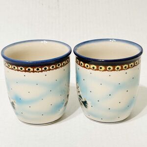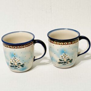 2 Polish Pottery Bolesławiec Zakłady Mug Snowy Christmas Pine Tree Star Blue Sky
