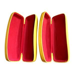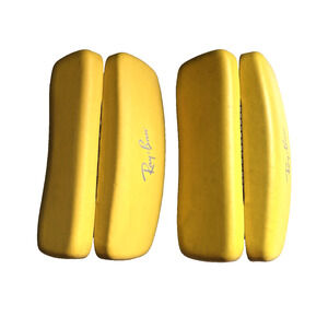 2 RAY BAN brand sunglasses / eyeglasses storage cases. These are both bright yellow hard clam shell style with hinged lid that snaps shut easily. Inside is lined with red velour - the Ray-Ban logo is in silver script on the top of each lid. These are the perfect accompaniment to your favorite Ray-Ban glasses - a matching pair and you are purchasing both for one price! Both in good pre-owned condition - minor surface wear/scuffs but no damage or flaws - fantastic unisex look!