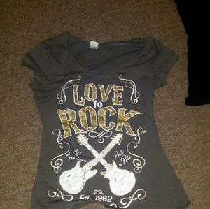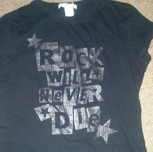 2 cute rock t-shirts. Great condition. Black one is a size large but fits like a med. Other is a med and is a brownish green color.. By Charlotte russe