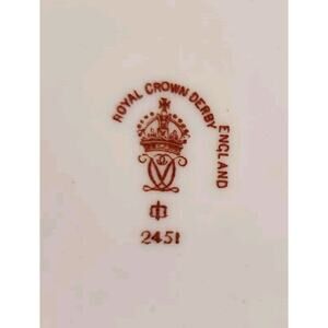 Saucers are marked with red Royal Crown Derby mark that dates it to 1913. Both are marked with pattern number 2451.