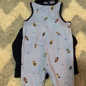 One pair of blue plaid overalls with button up hooded jacket. Overalls button between the legs for diaper changes. Two buttons at top of overalls.
