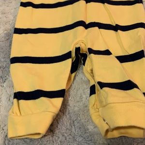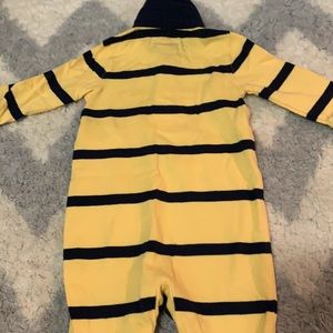 Yellow one piece rugby style outfit. One small stain on hem of buttons, barely noticeable. Buttons between legs for diaper changes.