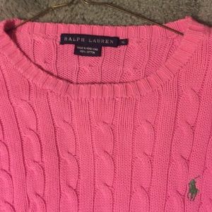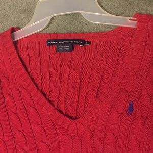 1- pink polo swoop neck sweater with green logo 1-red polo v-neck sweater with navy logo.