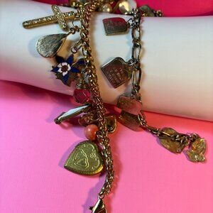 This Two Bracelets are unique One is with the 10 Commandments, gold plated, and the other one is with unique charms collections, Teddy Bear, Mother of Pearl Heart, Caged Pearl, Cute Bell Lace Cut, Enamel Rose Cameo, Charm Key, Rhinestone Cross, Mother of pearl Tear Drop, Flower Enameled, Cut Crystal purple , Gold charm Rose, White Charm, Pearl Heart, Pink Bead, Heart Locket Mini 6/8", Heart Locket 1/2", all in good condition.