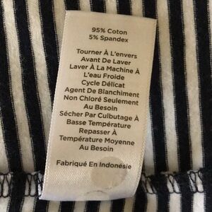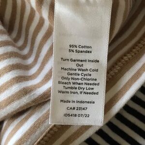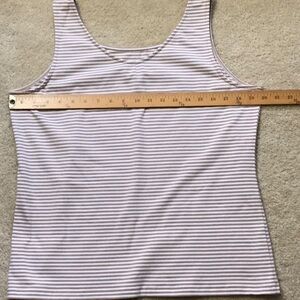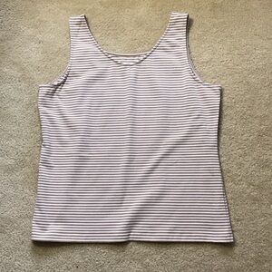 Scoop neck or V neck. Tanks are reversible. Tan/white and very dark navy/white. The navy is hard to determine but I don’t think it’s black. Receive both for one price.