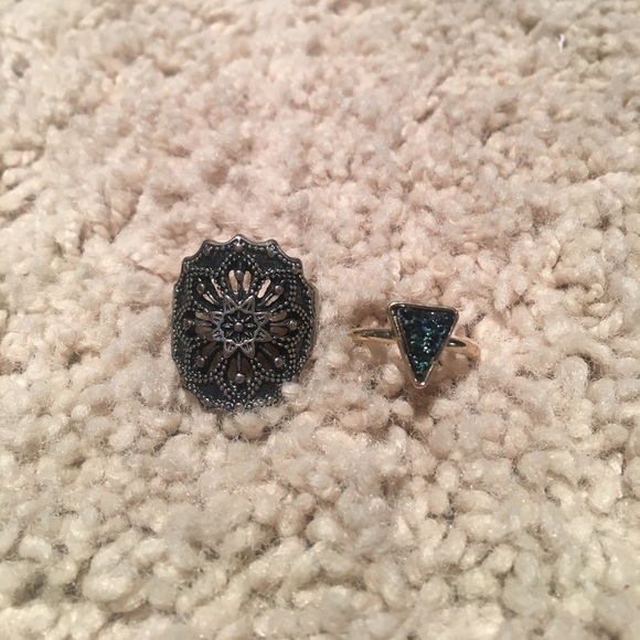 2 Ring Bundle. Left is silver with detail, size 7. Right is gold with green shimmer in triangle, size 7