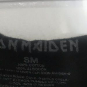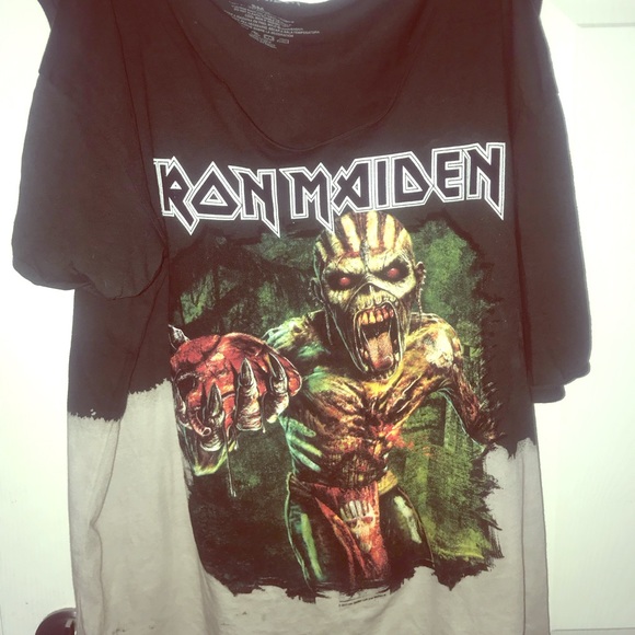Iron Maiden(Adult male small?) LoveCulture(medium/large women’s). Cut diy style but I purchased them like this.