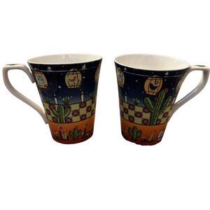Each mug has a small chip on the top. Please see photos these are selling as is. The product is a medium-sized Saint James Fine China hankook 1351 Desert Light coffee tea mug with a small chip. It features a multicolor Desert pattern, a 12 oz capacity, and is suitable for both hot and cold beverages. Made of fine china, this mug has a height of 4.5 inches and a width of 3.5 inches, making it perfect for serving one person. Collectors or those looking for a unique addition to their kitchenware collection may appreciate this branded mug.