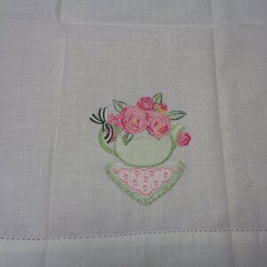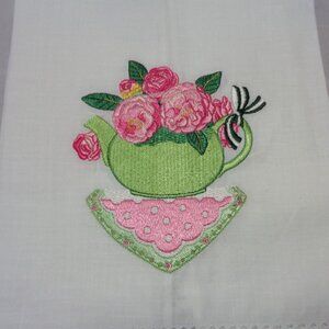 Two Sandy Clough ramie and cotton tea towels or hand towels with an embroidered tea pot filled with pink roses on each towel. Each measures 22" l x 14" w. Never been washed. Xposted