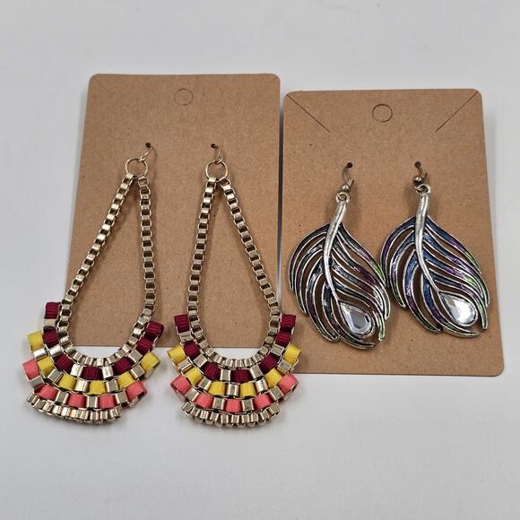 2 Set of Earrings Feather Shape Enameled Rhinestone & Avon Boho Weave Multicolor