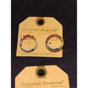 The product is a pair of multicolor rhinestone earrings from the brand Crystal Avenue. They feature a round shape with a prong setting style and are perfect for a birthday occasion. Made in India, these stud earrings are not antique or vintage, and they are not signed or personalized. The earrings are crafted with crystal and rhinestone materials, adding a touch of sparkle and elegance to any outfit.