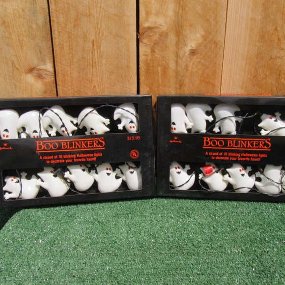 I am selling 2 Sets of Vintage Hallmark Ghost Boo Blinkers String Lights Plastic Blow Mold. They are pre-owned. They are string lights with 10 plastic ghost light covers. Both sets have been tested and work.