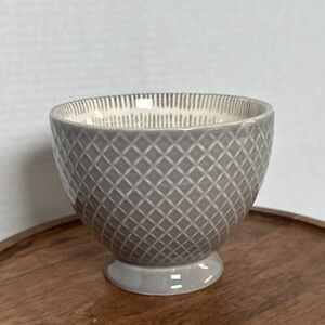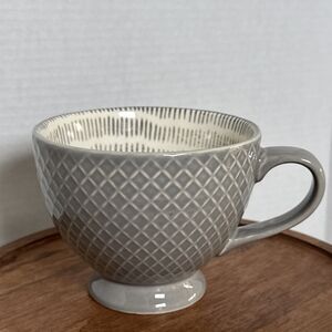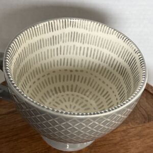 Cute pair of Signature Housewares mugs. They are 14 ounce stoneware mugs in two complimentary designs. Perfect gift basket items! One is a light gray zigzag pattern on the outside with a diamond pattern on the inside, and the second is a dark gray diamond pattern on the outside with lines and dashes on the inside. Neither of these mugs look like they have ever been used.
