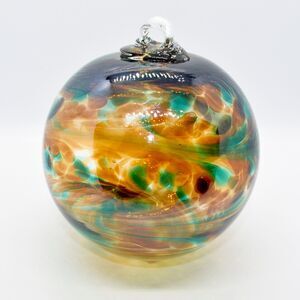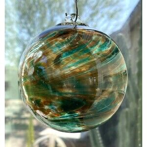 Beautiful hand blown glass gazing ball ornament or sun catcher. 4" heavy glass with green and amber swirled and speckled details - lovingly hand made in Arizona, each piece is a one of a kind creation.