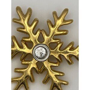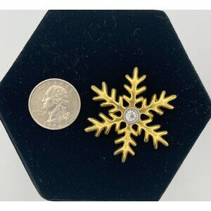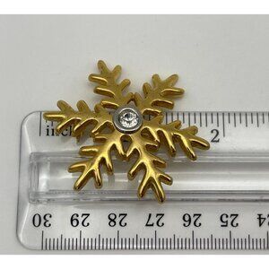 A stunning 2" snowflake brooch with a gold tone finish and a clear crystal rhinestone center, perfect for the holidays. Ideal for women's fashion.
