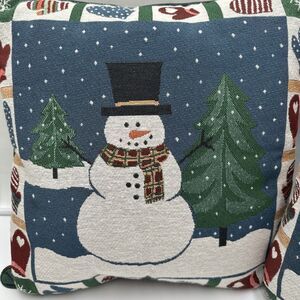 2 Snowman and Mittens Christmas Winter Tapestry Green Backing Throw Pillow 16”