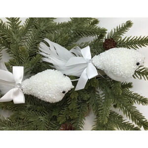 2 Songbirds White Glass Beaded Clip On Christmas Tree Ornaments Bright