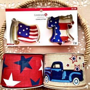 Patriotic - 2 Spools Wide Wired Ribbon, 2 Cookie Cutters, Rope Wreath Frame