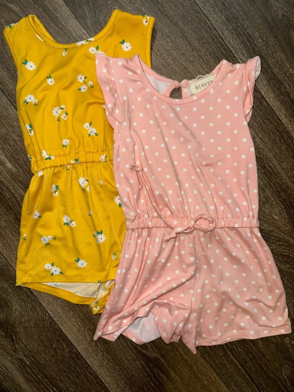 Floral and pink polka dot romper for girls. Soft, breathable fabric with a gentle elastic waist and tie for a comfortable fit. Cap sleeves and keyhole back add sweet detail. Perfect for everyday play and warm-weather outings.