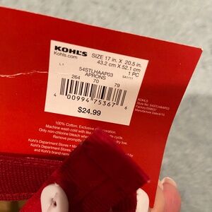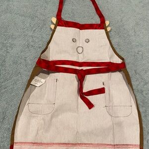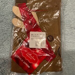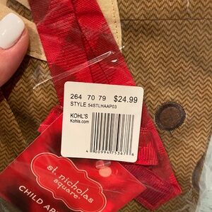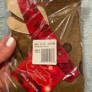 Set of two St. Nicholas Square children’s aprons in a festive red and brown Christmas reindeer design. One is brand new in the original package, and the other is brand new with tag attached. Made from 100% cotton, perfect for holiday baking, crafting, or gifting. Adjustable neck strap and tie-back waist for a comfortable fit.